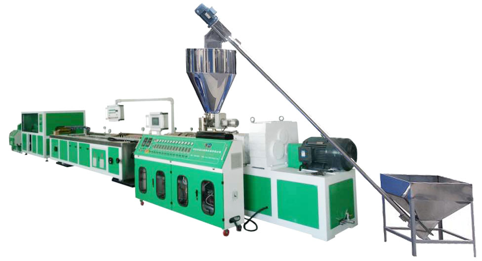 PVC格栅板生产线设备主要组成部分: 锥形双螺杆挤出机,模具,定型台,牵引机,切割机,堆料架。配套辅机:混料机,覆膜机。