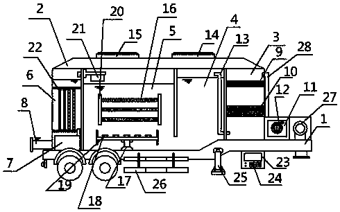 9.根据权利要求1-8任一项所述的污水处理半挂车,其特征在于:所述车架(1)上设有柴油发电机(27)和抽水泵(11),抽水泵(11)通过进水管(28)与格栅池(3)相连通;车架(1)下部设有控制器(23),控制器(23)通过导线与污水处理站相连,抽水泵(11)内设有抽水带(12)。