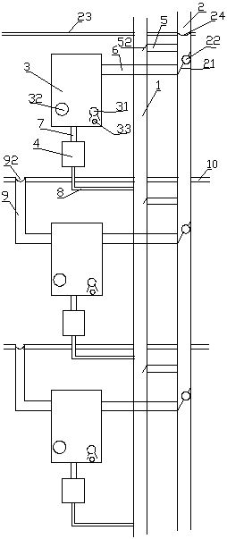 本实用新型在每层楼的下水管道和雨雪水管道中间设置溢流管,防止任何一层有管道堵塞的造成下层积水,在溢流管和下水管道接口处设置单向活动盖或单向阀防止下水管道水反流至雨污管进而进入储水箱,结构简单,使用方便。