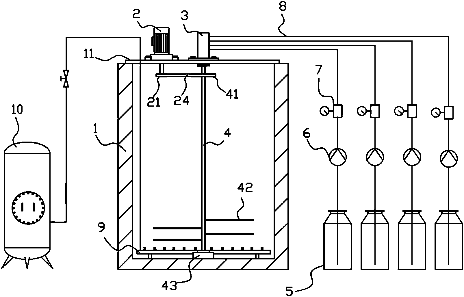 在旋转接头(3)的旋转端(302)固定有支撑管(4),在支撑管(4)内设有多根排液管(81),多根排液管(81)分别与旋转接头(3)的多个出液口(32)相连,在支撑管(4)上固定有多根支管(42),多根支管(42)分别与多根排液管(81)相连通,在支管(42)上开设有多个排液孔(421);