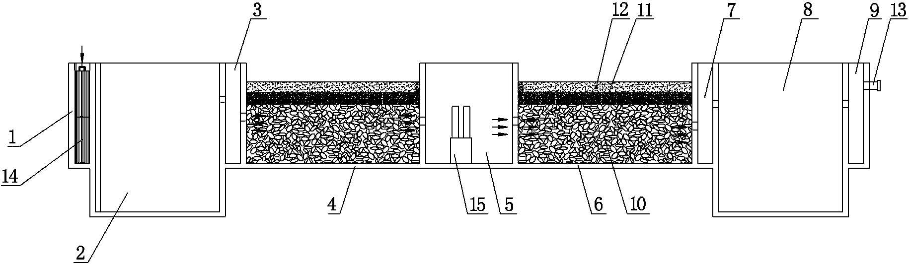 1.一种具有生物载体填料结构的生物污水处理总站,其特征在于:它包括从左往右顺次连通的格栅渠(1)、酸化调节池(2)、初滤池(3)、厌氧生物滤池(4)、充氧池(5)、好氧生物滤池(6)、终滤池(7)、植物检测池(8)以及放流渠(9),所述的酸化调节池(2)内添加有厌氧发酵菌,厌氧生物滤池(4)和好氧生物滤池(6)内均设置于生物载体填料结构,填料结构由从下往上顺次设置的卵石层(10)、米石层(11)和细沙层(12)组成,厌氧生物滤池(4)中米石层(11)和细沙层(12)内均添加有厌氧生物载体,好氧生物滤池(6)中米石层(11)和细沙层(12)内均添加有好氧生物载体,放流渠(9)的侧壁上设置有污水排出管(13),所述的格栅渠(1)内设置有扁钢栅条(14),所述的充氧池(5)内安装有曝气装置(15)。