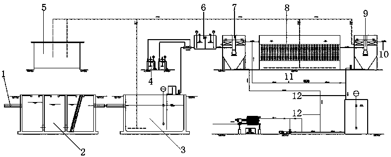 包括进水管,所述进水管连接隔油池,所述隔油池通过管道连接调节池,所述调节池通过管道连接混凝沉淀池,所述调节池与混凝沉淀池之间的管道设置混凝反应器,所述混凝反应器通过管道连接加药装置,所述混凝沉淀池通过管道连接好氧生化池,所述好氧生化池通过管道连接二次沉淀池,所述二次沉淀池上设置达标排放口。