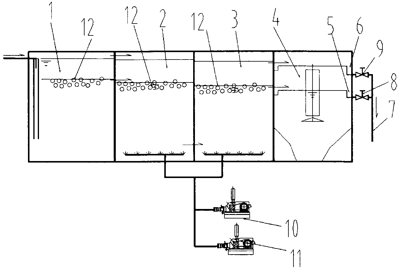 1.一种可提标扩容的城镇污水处理系统,该系统分为缺氧单元、一级好氧单元、二级好氧单元、沉淀单元4个部分;沉淀单元设立两个不同标高的集水槽,当排放标准要求不高或水量不大时,开启低位集水槽出水阀门,系统运行水位处于低位,缺氧池内投加池体容积10%的悬浮填料,一级好氧池、二级好氧池均投加池容体积30%的悬浮填料;当排放标准要求较高或水量较大时,关闭低位集水槽出水阀门,开启高位集水槽出水阀门,缺氧池内投加到池体容积20%的悬浮填料,一级好氧池、二级好氧池均投加到池容体积60%的悬浮填料。