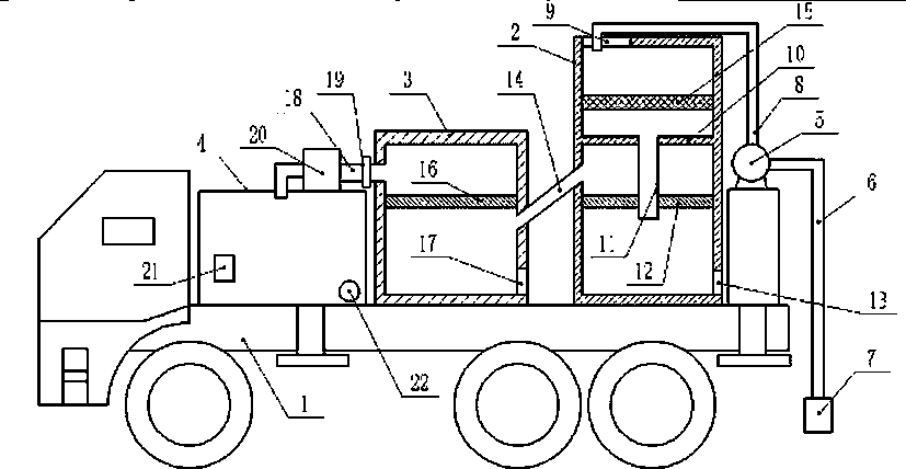 1.一种移动式污水处理装置,包括车体(1)、过滤器(20)、阀门(19)和出水口(22),其特征在于,所述车体(1)上设有第一沉淀池(2)、第二沉淀池(3)和蓄水池(4),第一沉淀池(2)的右端设有水泵(5),水泵(5)与第一沉淀池(2)之间连接有第一水管(8),水泵(5)上设有进水管(6),进水管(6)的进水端上螺纹连接有过滤嘴(7),第一水管(8)的出水端设在第一沉淀池(2)的上端;所述第一沉淀池(2)的内部中段设有横向的隔板(10),隔板(10)将第一沉淀池分为上过滤区和下沉淀区两部分,第一沉淀池(2)的顶部部设有污水进水口(9),污水进水口(9)下方的上过滤区内横向的设有隔网(15),隔板(10)中间位置处设有纵向的进水管(11),进水管(11)的出水管口上方设有横向的格栅(12),且进水管(11)穿过格栅(12),第一沉淀池(2)的左侧下部设有第一清污口(13),第一沉淀池(2)的右侧设有出水口,出水口在下沉淀区且在格栅(12)的上方;所述第二沉淀池(3)的左侧中部设有进水口,第一沉淀池(2)的出水口和第二沉淀池(3)的进水口之间连接第二水管(14),第一沉淀池(2)的出水口在高度上高于第二沉淀池(3)的进水口,第二沉淀池(3)的进水口上方内部设有横向的滤网(16),第二沉淀池(3)的左侧下部设有第二清污口(17),第二沉淀池(3)的右侧上部设有出水口,第二沉淀池(3)的出水口在滤网(16)的上方,且第二沉淀池(3)的出水口连接第三水管(18),第三水管(18)上设有阀门(19),第三水管(18)连接到过滤器(20);所述过滤器(20)的出水端设在蓄水池(4)内,且蓄水池(4)内设有除味盒(21),蓄水池(4)上还设有清水出水口(22),清水出水口(22)上设有密封盖。