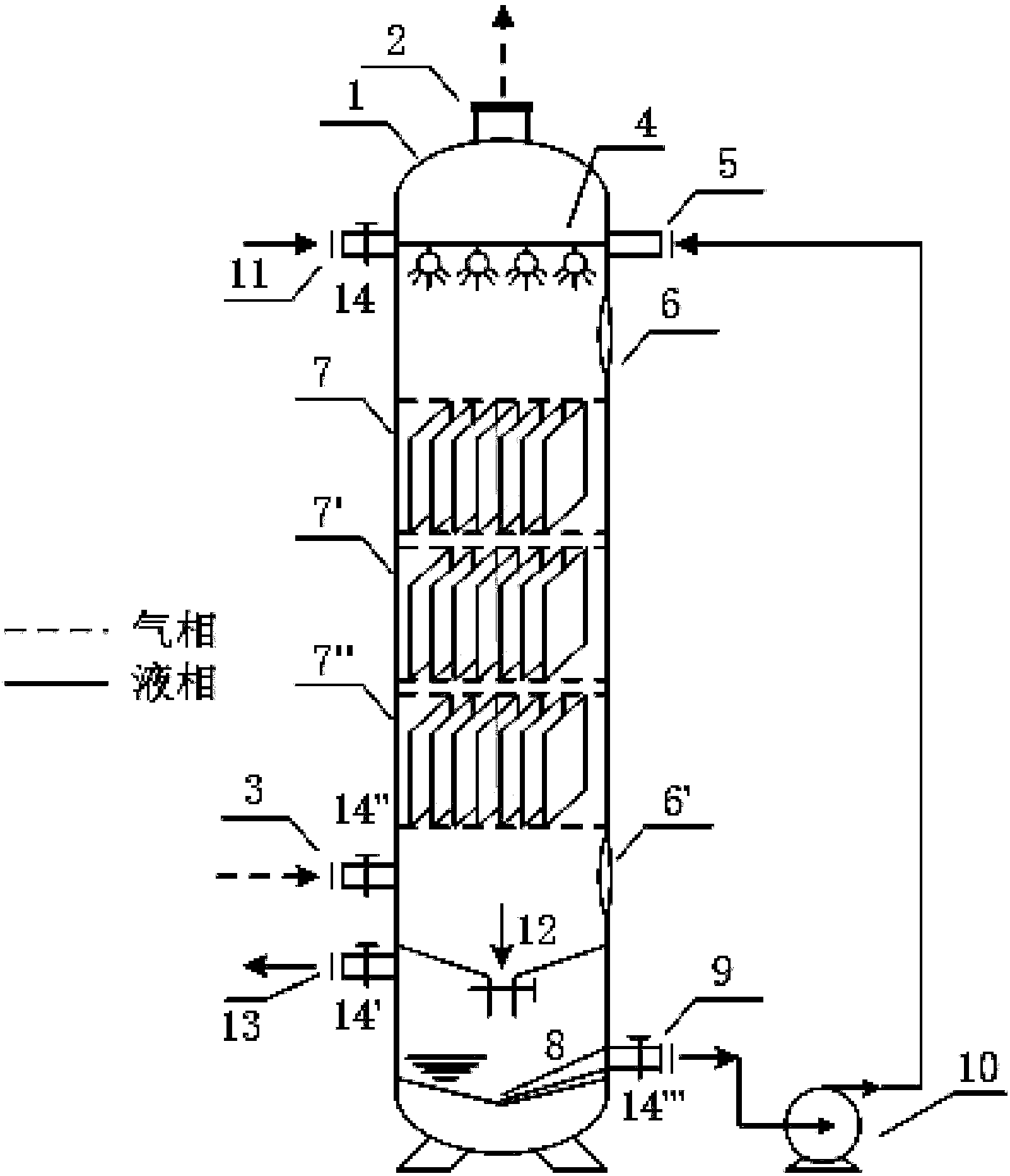 优选地,所述的循环营养液,包含K2HPO4、KH2PO4、MgSO4、FeSO4、CaCl2,此外,根据处理废气的性质差异可以适当加入KNO3或微量CH3OH或CH3CH2OH。当处理废水时,方法如下所述:活性污泥随同循污水从进入口11,在反应器塔体1空间内循环流动,经过数周的循环和富集。此时酶浮填料表面会逐渐变黄褐色,即为活性生物膜。