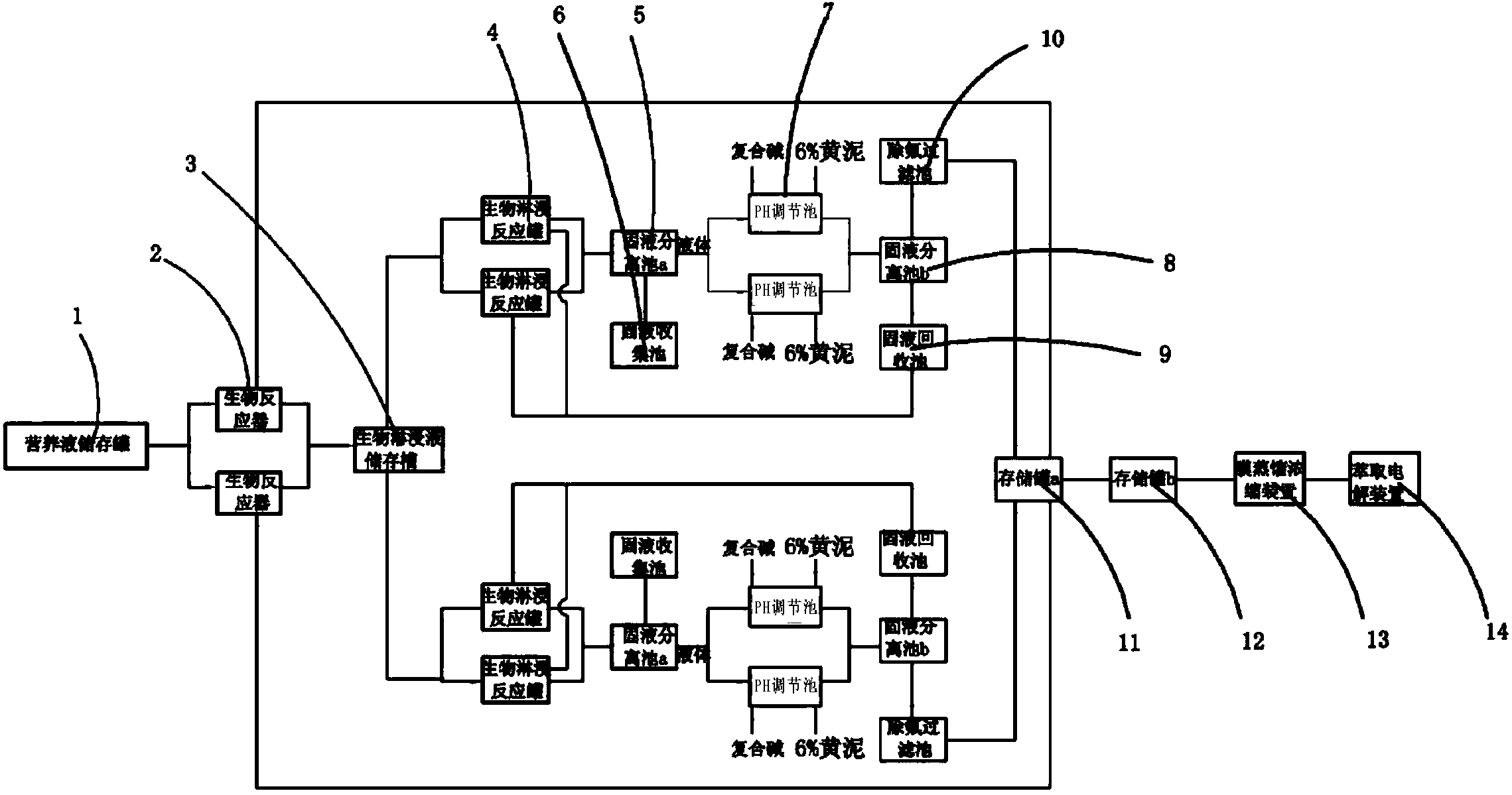 作为优选,所述培养液储存罐的出液口并列连接有两组生物反应器,两组生物反应器的出液口分别连接着生物淋浸液储存槽。