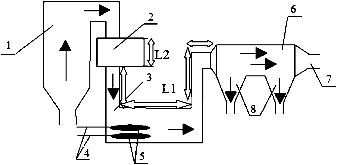 再进一步地,所述空气预热器出口烟道(3)为“几”字型或“U”型或“L”型,空气预热器出口烟道(3)的总长度L1与空气预热器(2)的长度L2之间的长度比为2~3:1。