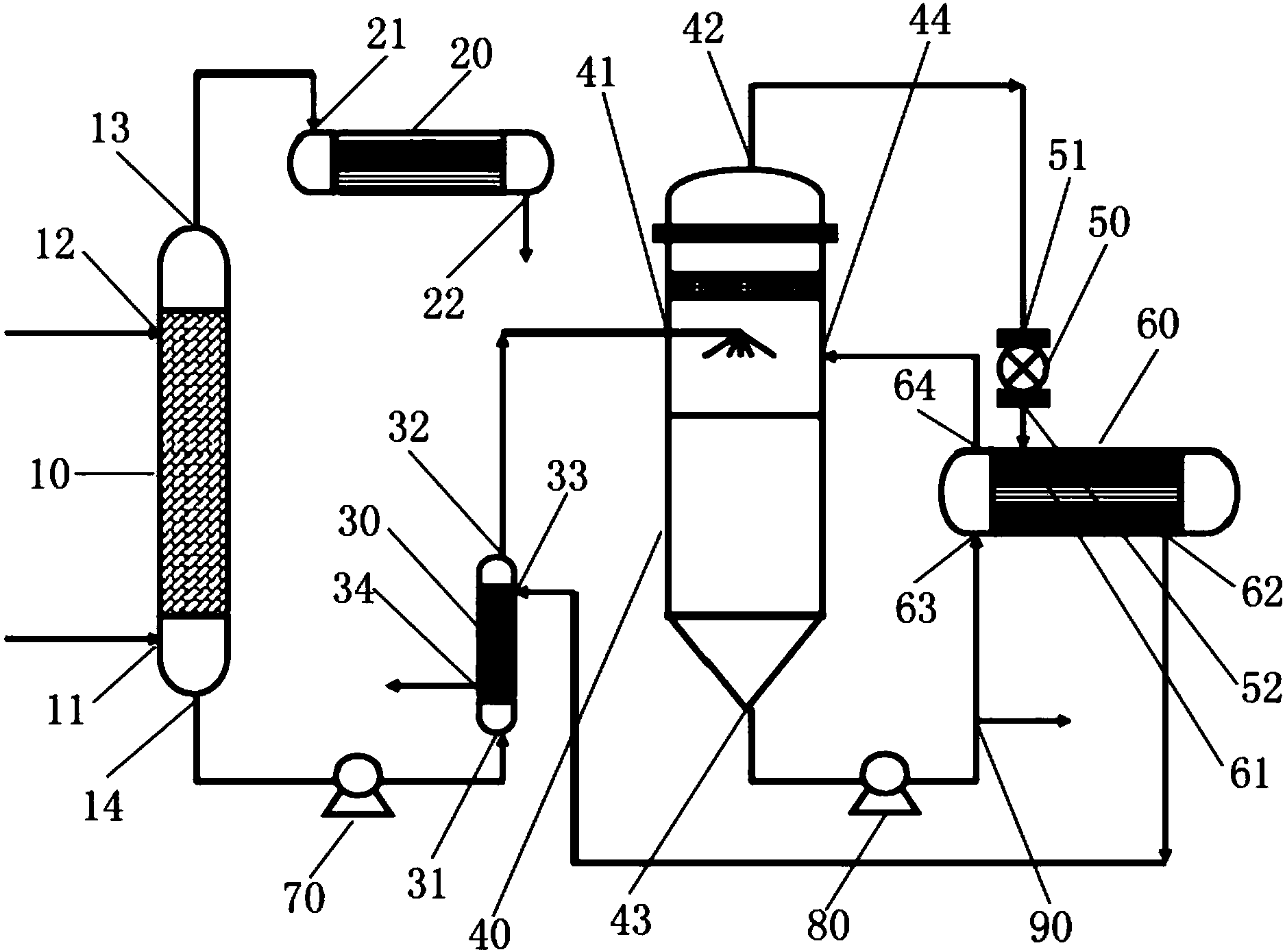 (3)-2、从MVR蒸发器(40)的第一出料端口(42)被排出的MVR气相物料通过MVR压缩机(50)的进料端口(51)进入压缩机(50)中,经压缩处理后,依次通过压缩机(50)的出料端口(52)和MVR热交换器(60)的第一进料端口(61)进入MVR热交换器(60)中,经过热交换后,再依次经过MVR热交换器(60)的第一出料端口(62)和MVR预热器(30)的第二进料端口(33)进入MVR预热器(30)中,进一步热交换后,MVR气相物料变成MVR液相产物,MVR液相产物从MVR预热器(30)的第二出料端口(34)排出,收集;