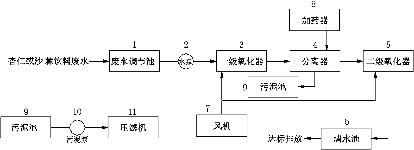 1.一种用于杏仁饮料和沙棘饮料生产废水的处理方法,其特征在于所述设备包括钢筋混凝土或钢结构的废水调节池、清水池、污泥池,钢或钢筋混凝土结构的一级氧化器、二级氧化器、分离器、加药器、压滤机、罗茨风机、水泵、污泥泵;其处理方法包括如下工艺步骤: