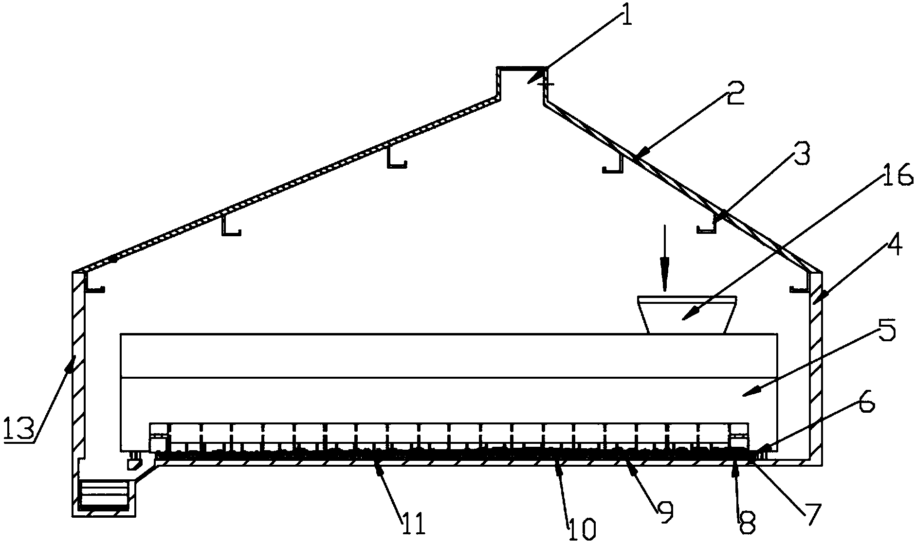 1.一种可以处理污泥的阳光房及其处理工艺,其特征在于,包括本体、保温墙、翻抛机、平板干化元件、软管和蒸汽进汽总管道,所述软管包括输水软管和进汽软管,本体包括地板、主体和屋顶,本体采用不对称结构,屋顶的顶端设置有抽气孔并且屋顶采用玻璃材料制作,屋顶的内部设置有积水槽,主体的外部设置有保温墙,翻抛机安装在主体的内部并且翻抛机与进泥口相连,平板干化元件位于翻抛机的下方并且平板干化元件的下端设置有输水软管、保温层、支撑柱、进汽软管、输水总管道和蒸汽进汽总管道,输水软管与输水总管道连通,进汽软管与蒸汽进汽总管道连通,保温层位于支撑柱和平板干化元件之间,平板干化元件末端设置有干泥掉落轨道,干泥掉落轨道与皮带输送系统相连。