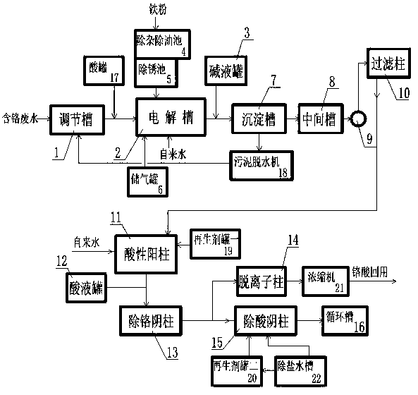 3.根据权利要求1所述的一种连续式含铬废水处理装置,其特征在于,还包括循环槽(16),所述循环槽(16)与除酸阴柱(15)连通。