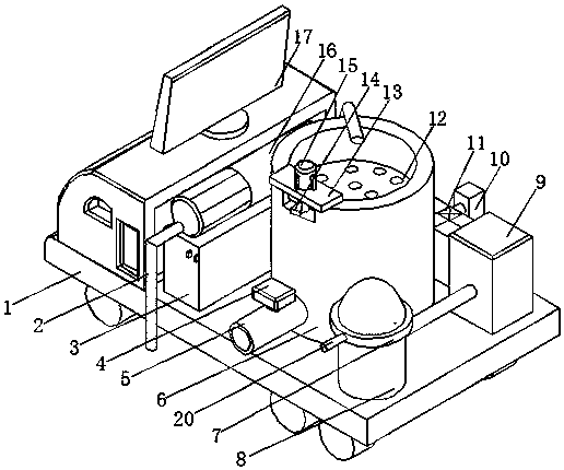 1.一种移动式水处理装置,包括车体(1),其特征在于:所述车体(1)上表面设置有沉淀过滤池(6),所述沉淀过滤池(6)内部设置有过滤网(12),沉淀过滤池(6)上部设置有凹槽,所述凹槽内部设置有绞轮(14),凹槽上方设置有支撑板(13),所述支撑板(13)位于沉淀过滤池(6)上端面,所述支撑板(13)上表面设置有第二驱动电机(15),所述第二驱动电机(15)输出轴和绞轮(14)转轴通过键连接,且所述沉淀过滤池(6)下部设置有排污口(5),所述排污口(5)处设置有阀门(4),且所述沉淀过滤池(6)一侧设置有蓄电池(3),所述车体(1)驾驶室上表面设置有太阳能电池板(17),所述太阳能电池板(17)通过逆变器与蓄电池(3)电连接,所述蓄电池(3)上方设置有吸水装置(16),所述吸水装置(16)内部设置有动力装置,且所述吸水装置(16)出水端通过水管(2)与沉淀过滤池(6)顶端进水口连接,且所述沉淀过滤池(6)中部侧面上设置有出水口,所述出水口通过水管(2)与水泵(11)进水口连接,所述水泵(11)转轴通过键和第一驱动电机(10)输出轴连接,水泵(11)出水口通过水管(2)与生物处理池(9)进水口连接,所述生物处理池(9)出水口通过水管(2)和蒸发罐(8)进水口连接,所述生物处理池(9)和蒸发罐(8)均位于车体(1)上表面,蒸发罐(8)内部设置有加热装置(19),蒸发罐(8)上部设置有收集盘(7),所述收集盘(7)上开有环形槽(18),所述环形槽(18)上设置有净水出口(20),并且蓄电池(3)与车体(1)控制室内的控制器电连接,控制器分别与吸水装置(16)内的动力装置、第一驱动电机(10)、第二驱动电机(15)和加热装置(19)电连接。