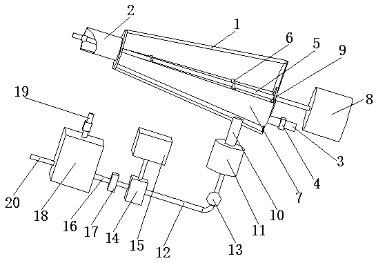1.一种复合式水处理消毒装置,包括壳体(1),其特征在于:所述壳体(1)的左侧端面设有进水管(2),所述壳体(1)的右侧面设有排污管(3),所述排污管(3)上设有排污阀(4),所述壳体(1)内设有转轴(5),所述转轴(5)表面通过网架(6)固定有过滤网(7),所述转轴(5)的右端贯穿壳体(1)的右侧端面通过联轴器与变频电机(8)的轴相连,所述壳体(1)右端下侧面设有出水管(10),所述出水管(10)的端部与增压泵(11)的进口相连,所述增压泵(11)的出口设有与水射器(14)进水口相连的导流管(12),所述导流管(12)上设有压力表(13),所述水射器(14)的进气口通过管道与臭氧发生器(15)的出口相连,所述水射器(14)的出水口通过混合管(16)与混合罐(18)的进口相连,所述混合管(16)上设有单向阀(17),所述混合罐(18)的顶部设有排气管(19),所述排气管(19)上设有排气阀,所述混合罐(18)的出口设有排流管(20)。