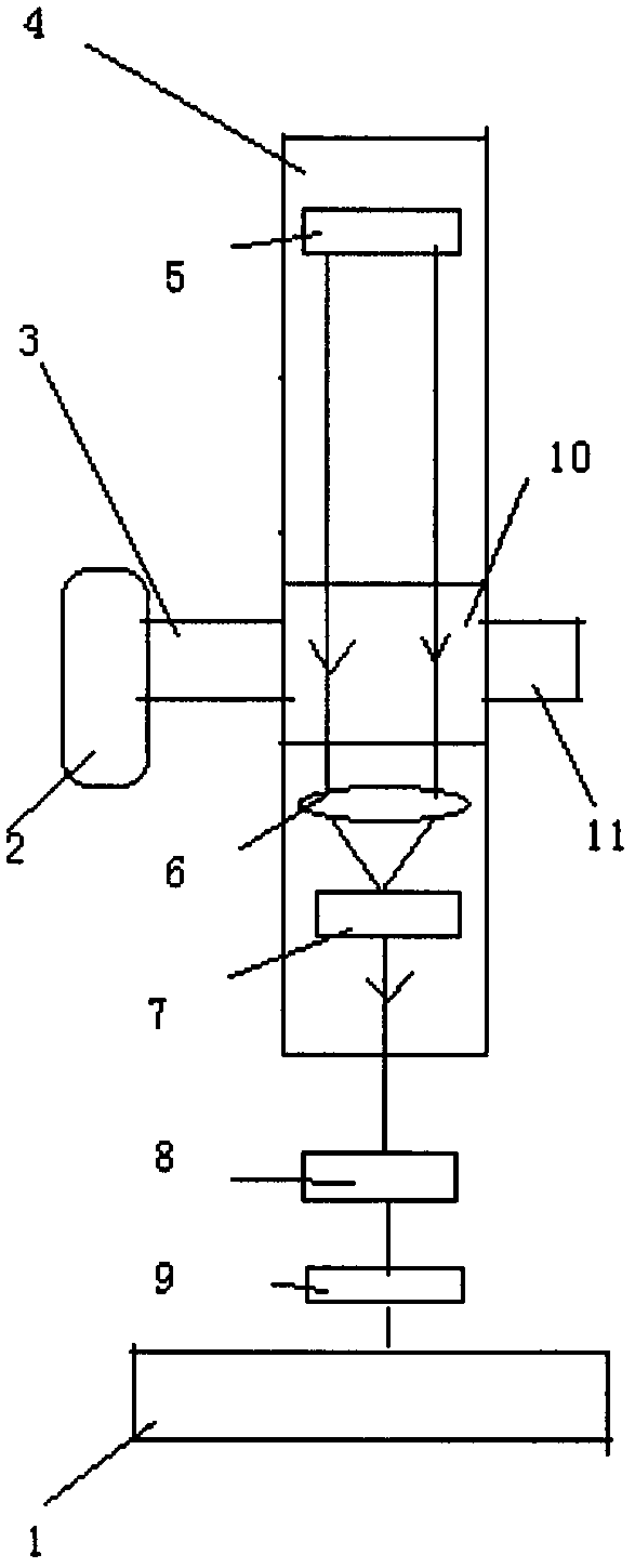 1.污水BOD散射式检测台,其特征在于:包括设置在污水池(2)右侧的污水管(3),污水管(3)的右侧与透明检测室(10)的进水口相连,透明检测室(10)右侧与出水管(11)固结;所述的透明检测室(10)安装在散射式检测装置机架(4)的中部,所述的散射式检测装置机架(4)内依次从上到下设置有散射式LED单色光源(5)、透明检测室(10)、透镜(6)、光电传感器(7);光电传感器(7)的输出信号通过滤波放大器(8)、DSP处理器(9)送到计算机(1)。