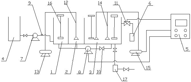 一种高效生物膜法处理高含盐废水试验系统。随着我国众工业的迅速发展,排入环境中的高含盐废水的量也越来越多,这类废水的盐度较高,其中的无机盐会对普通活性污泥产生严重的抑制作用。一种高效生物膜法处理高含盐废水试验系统,其组成包括:进水箱(4),进水箱通过管路与进水泵(7)连接,进水泵通过管路与缺氧池(1)连接,缺氧池池壁与DAT池(2)池壁连接,?DAT池池壁与IAT池(3)池壁连接,缺氧池、DAT池和IAT池分别与污泥回流泵(8)连接,污泥回流泵与PLC控制箱(5)连接,IAT池通过管路分别与排水池(6)、污泥池(17)连接。本实用新型应用于处理高含盐废水装置。