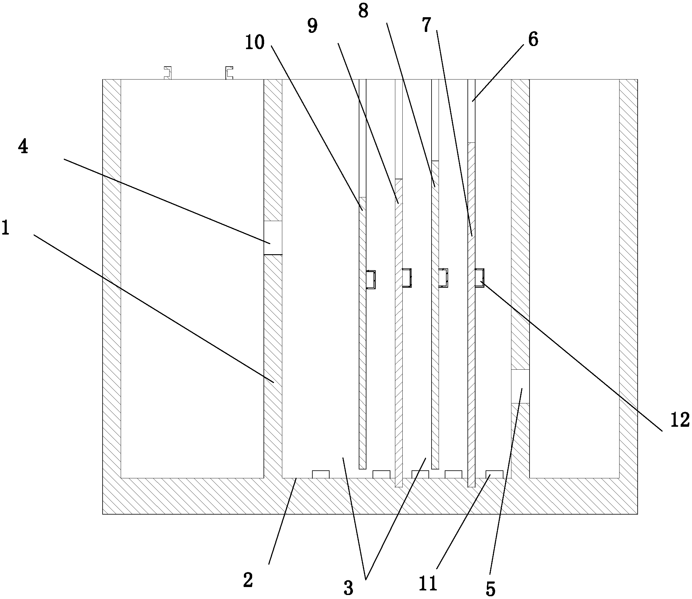 本实用新型进一步设置为:所述U型流道由挡流板构成,池体上设有凹槽,挡流板安装在池体的凹槽上,挡流板和池底之间间隔设有供污水流通的通道,挡流板高度沿液流方向依次下降。