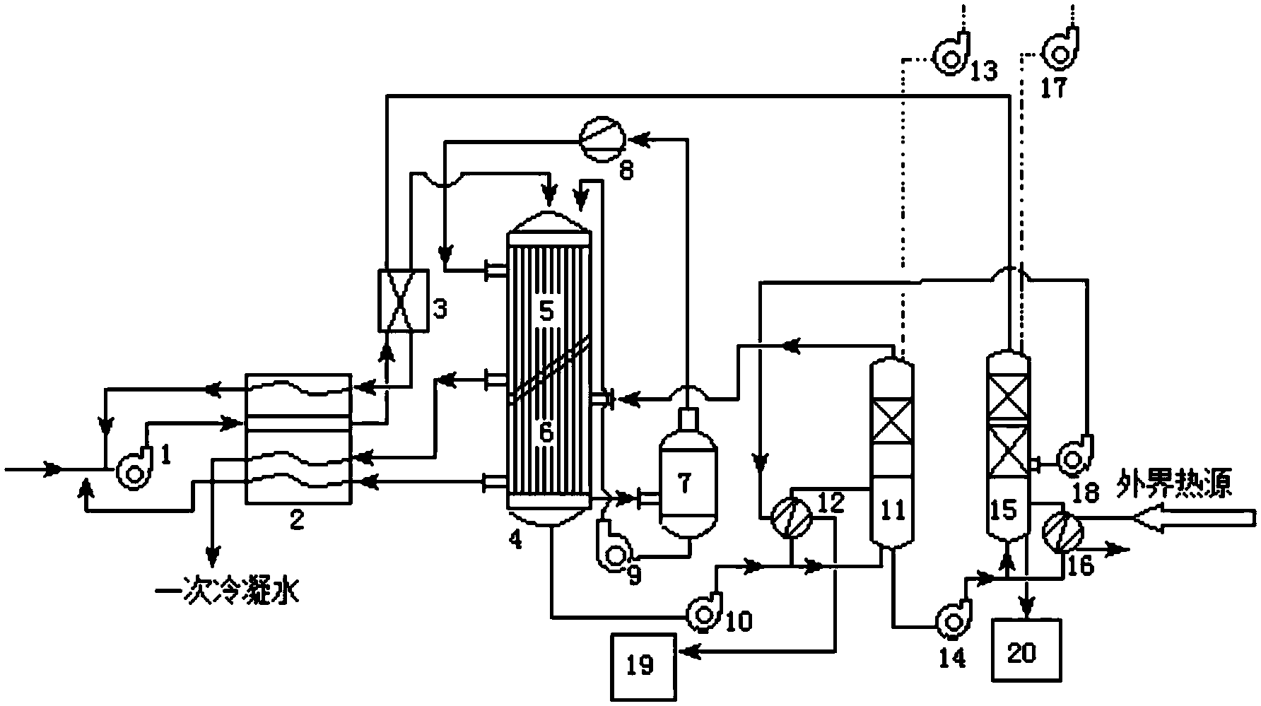2、充分利用了含有水溶性有机溶剂废水精馏或蒸馏过程中产生的蒸汽的潜热,解决了机械蒸汽压缩过程中,含有水溶性有机溶剂废水在机械蒸汽再压缩蒸发器中,仅靠机械蒸汽再压缩机产生的二次蒸汽,温升不够而导致的浓缩比例不高的问题,使机械蒸汽压缩浓缩后的浓缩液的水溶性有机溶剂浓度进一步提高,提高了热效率,降低了精馏或蒸馏过程的废水量及能耗。