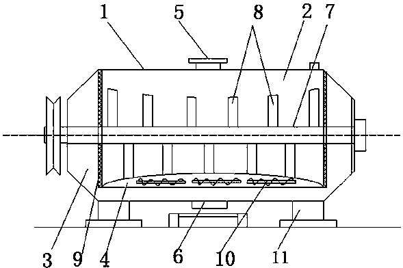 1.一种高效污泥干化炉,所述的污泥干化炉为圆柱形的筒体,所述的筒体横放在固定支架上,筒体内设有横向搅拌轴和垂直搅拌桨,筒体顶部设有进料口,筒体底部设有出料口,其特征在于,所述筒体的内部设有U型截面的干燥仓和矩形截面的搅拌仓,所述的搅拌仓设置在干燥仓的内部,所述的干燥仓的底部连通出料口,所述搅拌仓的两侧与干燥仓相连通,所述搅拌仓与干燥仓的连通位置上设有过滤筛网,所述搅拌仓的底部设有加热层,所述的加热层内设有多组加热线圈。
