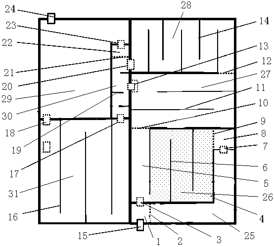 1.一种高低并列式难降解废水处理装置,其特征在于,由气浮分离区(25)、曝气铁炭区(26)、厌氧区(27)、好氧区(28)、回流混合区(30)、缺氧区(31)及沉降分离区(29)组成,它们的空间排列为回流混合区(30)置于中间,气浮分离区(25)、曝气铁炭区(26)、厌氧区(27)、好氧区(28)、沉降分离区(29)及缺氧区(31)在其四周依次排列,气浮分离区(25)与曝气铁炭区(26)等高,厌氧区(27)与好氧区(28)等高,回流混合区(30)、缺氧区(31)及沉降分离区(29)等高,上述等高区与等高区之间的空间高度依次分别降低20~50cm,形成推动水质流动的位差,厌氧区(27)、好氧区(28)和沉降分离区(29)分别开有流向回流混合区(30)的第一过流口(13)、第二过流口(20)和第三过流口(23),回流混合区(30)开有自然流进缺氧区(31)的第四过流口(17),其中,气浮分离区(25)上设有原水及药剂加入口(15),气浮分离区(25)通过第一过流堰(9)与曝气铁炭区(26)连通,曝气铁炭区(26)通过第二过流堰(10)与厌氧区(27)连通,厌氧区(27)通过第三过流堰(12)与好氧区(28)连通,缺氧区(31)通过第五过流口(18)与布设有出水口(24)的沉降分离区(29)连通。
