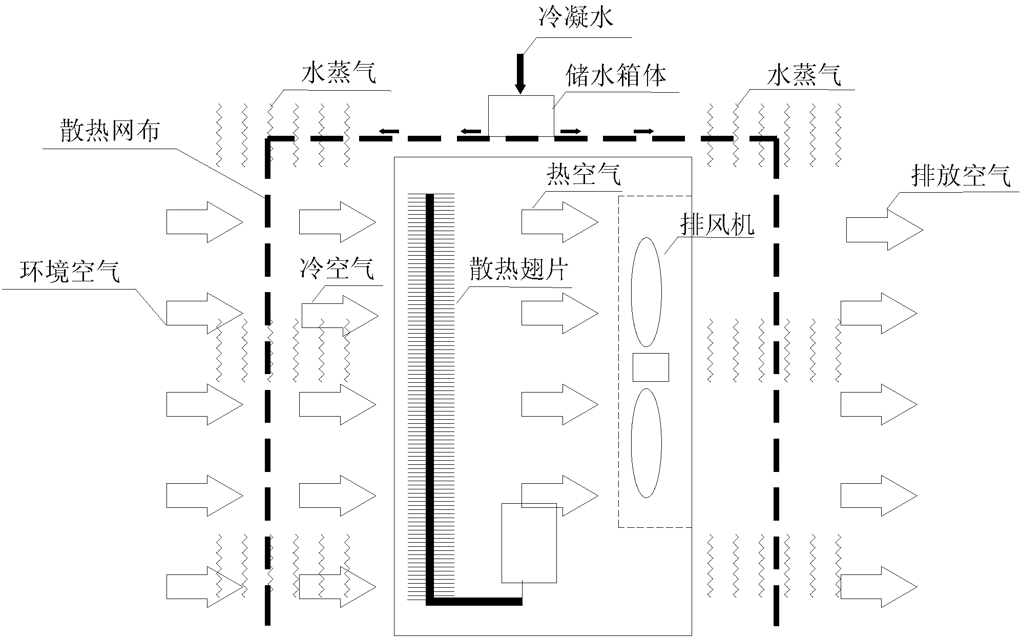 二、通过冷凝水扩散蒸发单元将储水单元内的冷凝水迅速均匀地扩散至冷 凝水扩散蒸发单元的各个部位;