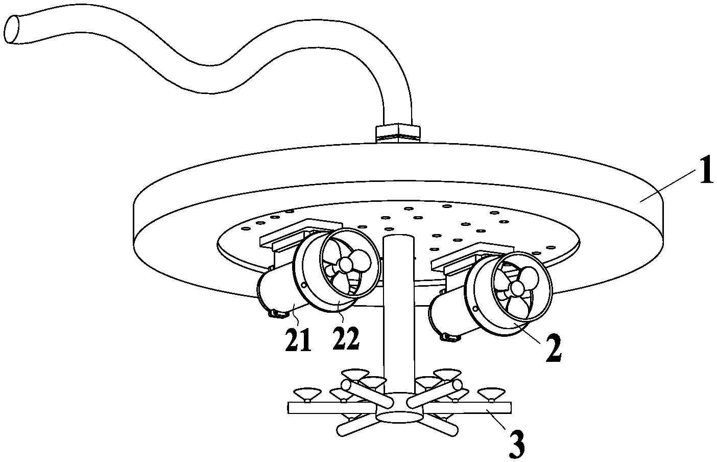 2.根据权利要求1中所述的一种用于污水处理的推进式曝气设备,其特征在于:所述 的推进装置(2)包括直流无刷电机(21)和螺旋桨(22),所述的直流无刷电机(21)与螺旋桨 (22)均有一对,且一对直流无刷电机(21)对称安装在所述内漂浮圈(11)下端面两侧,且所 述的一对螺旋桨(22)分别安装在一对直流无刷电机(21)端部。