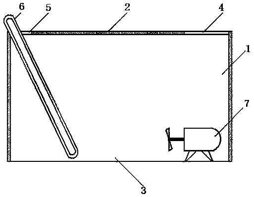 1.一种污水池的格栅除污机,由污水池、格栅除污机和潜水搅拌推进器组成,其特征是:污水池为有池盖的半封闭式结构,池盖的一侧有污物输出口,另一侧有检查检修进出口;格栅除污机分为除污面和回转面,除污面朝向污水池的另一侧倾斜安装在污物输出口和池底部之间;潜水搅拌推进器包括潜水电机和搅拌推进桨叶,潜水搅拌推进器安装在格栅除污机对面侧的池底部,搅拌推进桨叶的推进方向朝向格栅除污机的除污面。