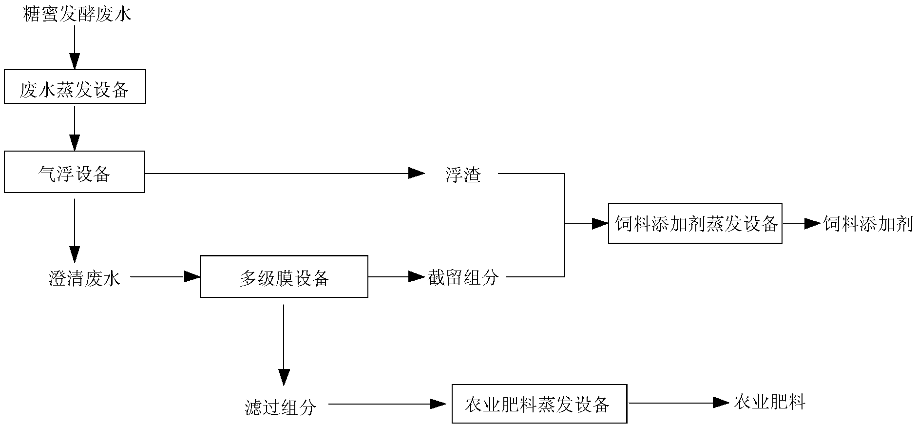 首先将糖蜜发酵废水经废水蒸发设备在一定温度和压力条件下抽汁汽蒸 发浓缩,然后通过气浮设备处理浓缩糖蜜发酵废水,得浮渣和澄清废水;将澄 清废水通过多级膜设备分离,得到截留组分和滤过组分;将气浮设备处理得到 的浮渣和截留组分送入饲料添加剂蒸发设备,经抽汁汽蒸发浓缩,即制备成饲 料添加剂产品;将滤过组分送入农业肥料蒸发设备,经抽汁汽蒸发浓缩,即制 备成农业肥料产品。