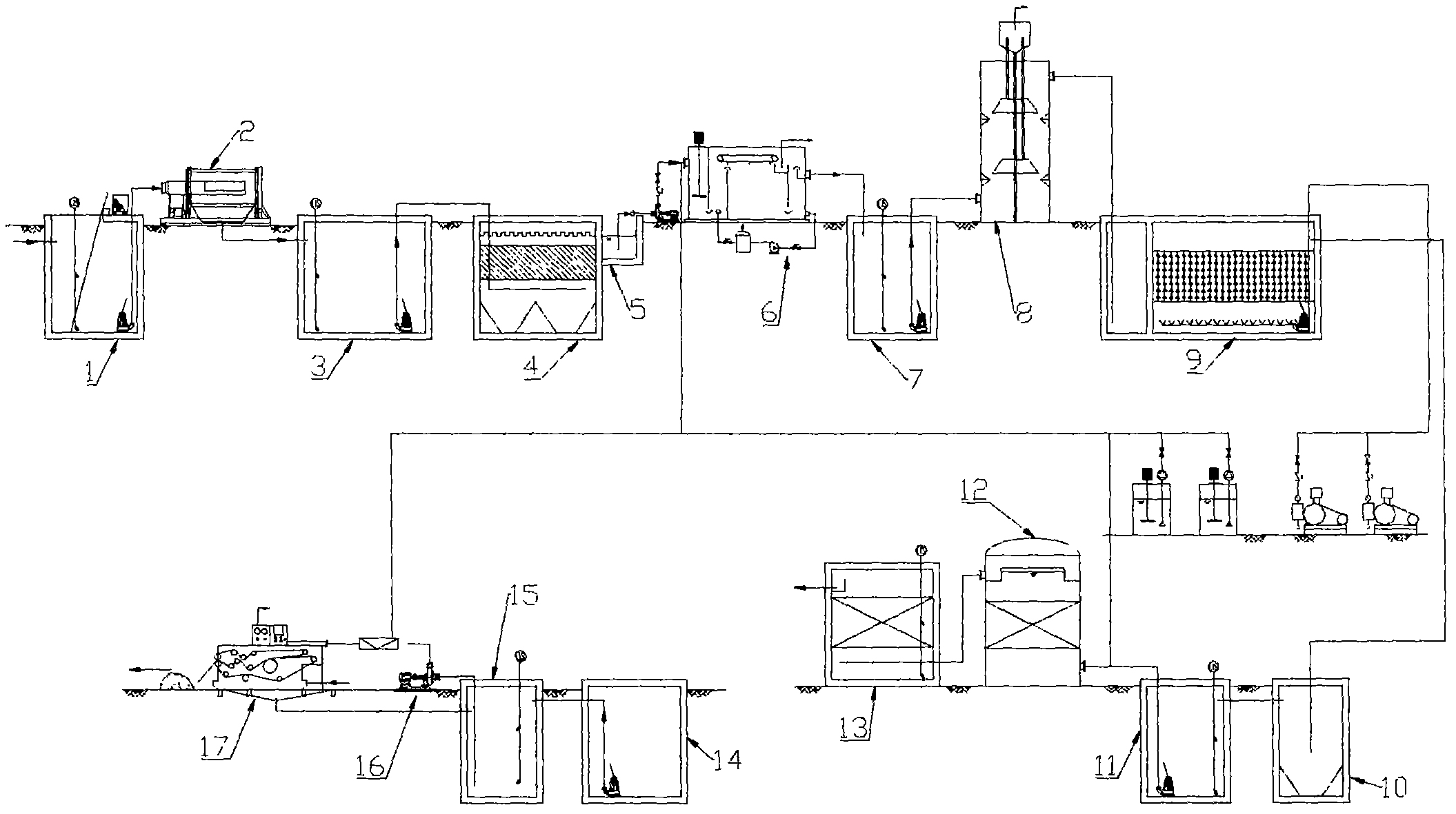 1.一种造纸行业专有废水处理装置,其特征在于,包括格栅井、微滤机、均质调节池、斜管沉淀池、集水井、混凝气浮机、缓冲水池、高效厌氧反应器、生物除磷系统、二沉池、中间水池、絮凝反应罐、滤池、污泥贮存池、污泥浓缩池、污泥泵和带式压滤机;所述格栅井的进口连接污水进水管,格栅井内的提升泵出口连接微滤机的进口,均质调节池的进口连接微滤机的出口,均质调节池内提升泵通过管道连接斜管沉淀池的进口,斜管沉淀池的出口与集水井的进口相连,混凝气浮机外置增压泵的进水管直接连接至集水井的池底,混凝气浮机外置增压泵的出水口通过管道与混凝气浮机的进水口相连,混凝气浮机的出口连接缓冲水池的进口;高效厌氧反应器的进口与缓冲水池内的提升泵相连,出口连接生物除磷系统进水口,二沉池的进水口通过管道连接生物除磷系统的出水口,二沉池的出水口通过管道与中间水池的进水口相连,絮凝反应罐的进口通过管道与中间水池内的提升泵相连,絮凝反应罐的出口连接滤池的进口;所述斜管沉淀池的静压排泥口、混凝气浮机的排空口、高效厌氧反应器排泥口、二沉池的排泥口和絮凝反应罐的排泥口通过管道汇集进入污泥贮存池的进口,污泥浓缩池的进口连接污泥贮存池内污泥泵的出口,污泥浓缩池上清液回流口通过管道连接格栅井的进口;污泥浓缩池的出口连接污泥泵的进口,带式压滤机的进料泵进口通过管道混合器与污泥泵的出口连接。