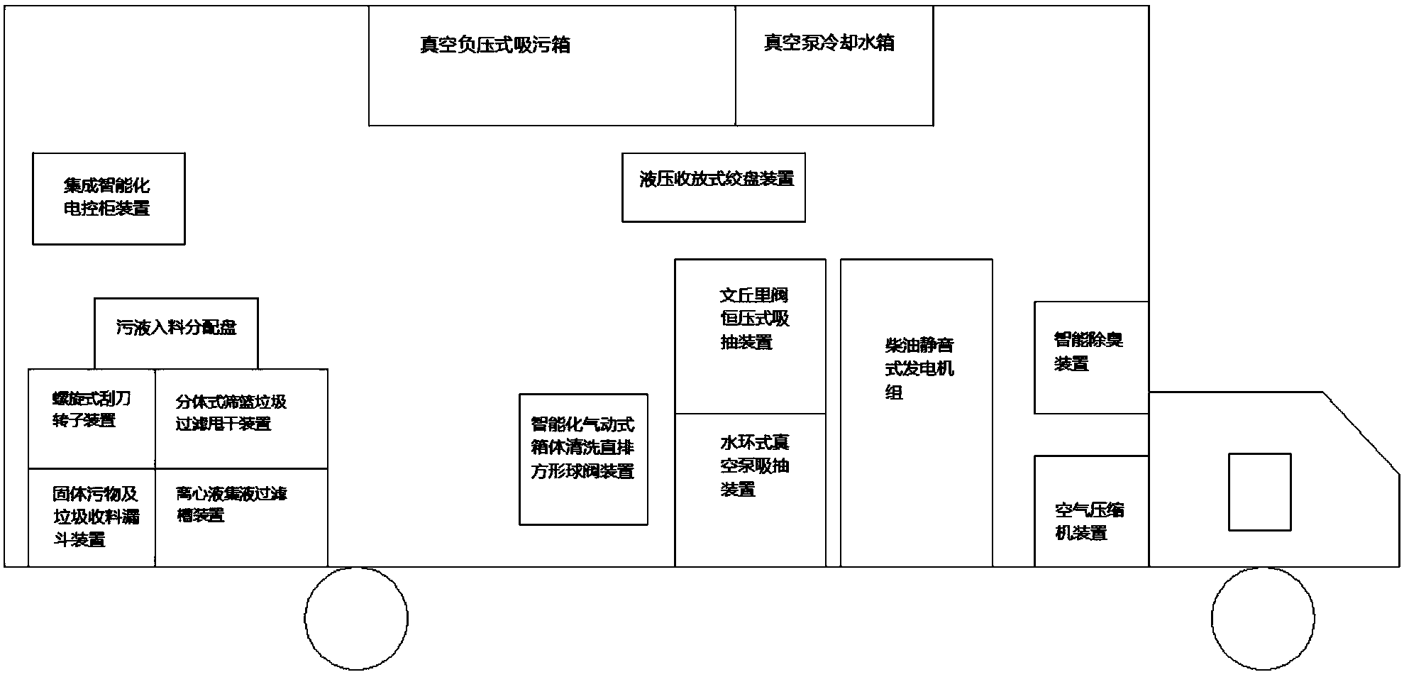 本实用新型设置了可快速拆卸的固体污物及垃圾收料漏斗装置,提高可维护性和便携性;水环式真空泵吸抽装置好处是,利用水冷方式使工作性能较之前的更加稳定,不至于工作一半因机械温度过高或夏季工作温差带来无吸力的现象;管道与线缆的压收放式绞盘装置可避免人工抬管,节约人工成本;柴油静音发电机给设备提供工作电源时,静音施工不扰民,且柴油比汽油更加安全;集成智能数控装置对整车装备提供智能化、数字化、可视化的操控装置,其位置调整到箱体后部的出料口处,可省去人工时时监督查看,更加便利,进一步节省人工成本;与集成智能数控装置连接的液位控制装置可对箱内液体高低位漫溢或排空起自动控制作用;智能化气动式箱体清洗直排方形球阀装置便于真空负压式吸污箱清洗排空,更人性化、更合理化,可避免人工进污液箱清理垃圾清理垃圾带来的困扰;实现了多功能联动的车载污水处理系统。