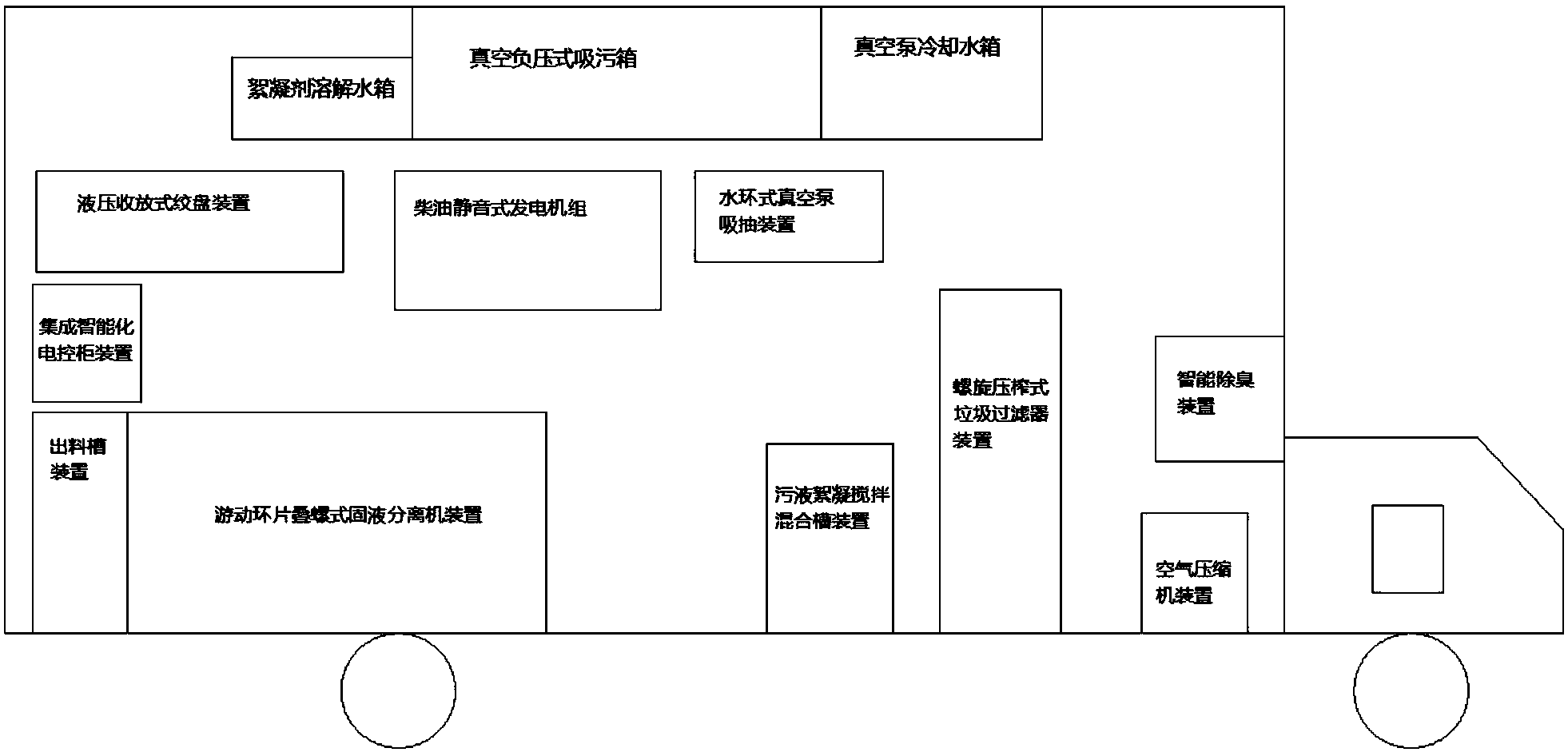 本实用新型设置了可快速拆卸的出料槽装置,提高可维护性和便携性;水环式真空泵吸抽装置好处是,利用水冷方式使工作性能较之前的更加稳定,不至于工作一半因机械温度过高或夏季工作温差带来无吸力的现象;管道与线缆的压收放式绞盘装置可避免人工抬管,节约人工成本;柴油静音发电机给设备提供工作电源时,静音施工不扰民,且柴油比汽油更加安全;集成智能数控装置对整车装备提供智能化、数字化、可视化的操控装置,其位置调整到箱体后部的出料口处,可省去人工时时监督查看,更加便利,进一步节省人工成本;与集成智能数控装置连接的各液位控制装置可对各箱内液体高低位漫溢或排空起自动控制作用;实现了多功能联动的车载污水处理系统。
