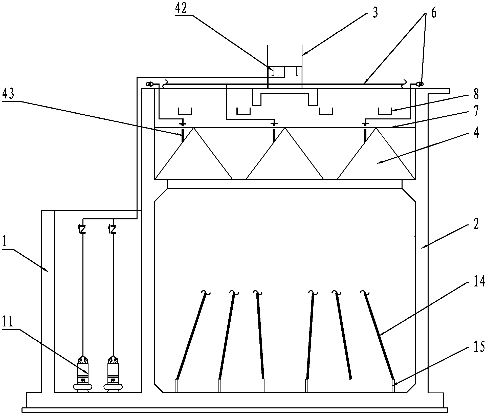 本实用新型自循环上流式厌氧污泥床系统,进一步的,所述厌氧反应池的两侧壁之间安 装槽钢,槽钢压在三相分离器的顶部。