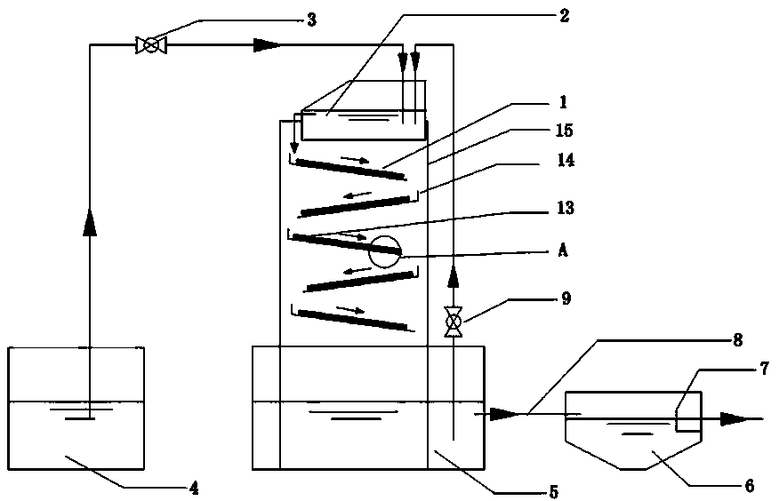 1.一种基于填料和折叠板的废水生物膜反应器,其特征在于:包括进水池(4)、布水槽(2)、供废水流经的重力导流装置、循环水池(5)、沉淀池(6)、用于支撑所述布水槽(2)和重力导流装置的支架(15),所述布水槽(2)通过管道及进水泵(3)连接进水池(4),布水槽(2)出水口处设置有齿状溢流槽,所述重力导流装置设置于布水槽(2)下方,包括在竖直方向上相隔一定间距层叠排布且各自倾斜一定角度的若干折叠板(1),相邻两块折叠板(1)的倾斜方向相反,所述折叠板(1)的上表面粘结有生物亲和性填料(13),布水槽(2)内的废水沿所述折叠板(1)由上向下呈折线形逐板流过落入位于重力导流装置下方的循环水池(5)内,所述循环水池(5)通过管道和循环泵(9)连接布水槽(2),同时还通过具有闸阀的连接管(8)连接带有出水口的沉淀池(6)。