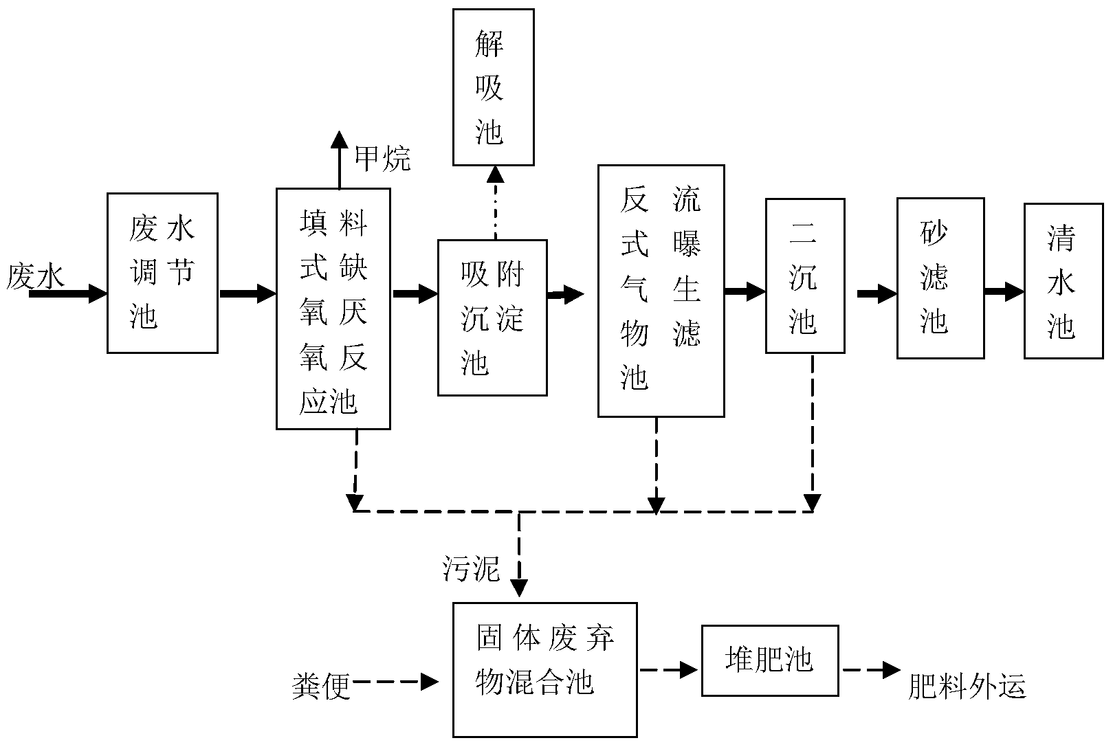 ⑥填料式缺氧厌氧反应池、二沉池和反流式曝气生物滤池产生的剩余污泥 排入固体废弃物混合池与猪粪便混合后进入堆肥池,好氧堆肥处理后的产物作 为农用肥料。