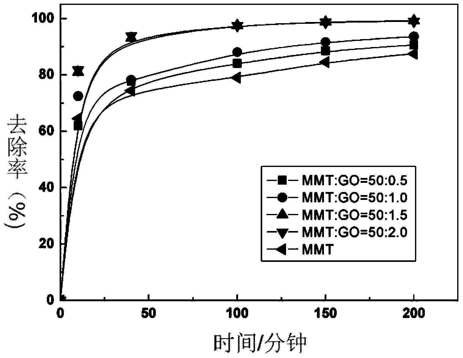 针对上述技术问题,本发明提供用于去除污水中有机染料的复合膨润土及其 制备方法,用以克服现有技术中因膨润土具有亲水性,使其去除污水中有机染料 吸附性能较低的缺点,同时也克服了单一的石墨烯材料作为吸附剂材料易团聚而 降低吸附效率的缺陷。本发明提供了一种复合膨润土-膨润土石墨烯的制备方 法,该方法环境友好、操作简单,由该方法制备得到的吸附剂对废水中亚甲基蓝 去除率高,实用性强。同时本发明还提供了一种由上述方法制备得到的复合膨润 土吸附剂在去除水中亚甲基蓝的应用方法,利用上述吸附剂,能有效去除水中亚 甲基蓝,处理时间短,去除率高。本发明的技术方案为: