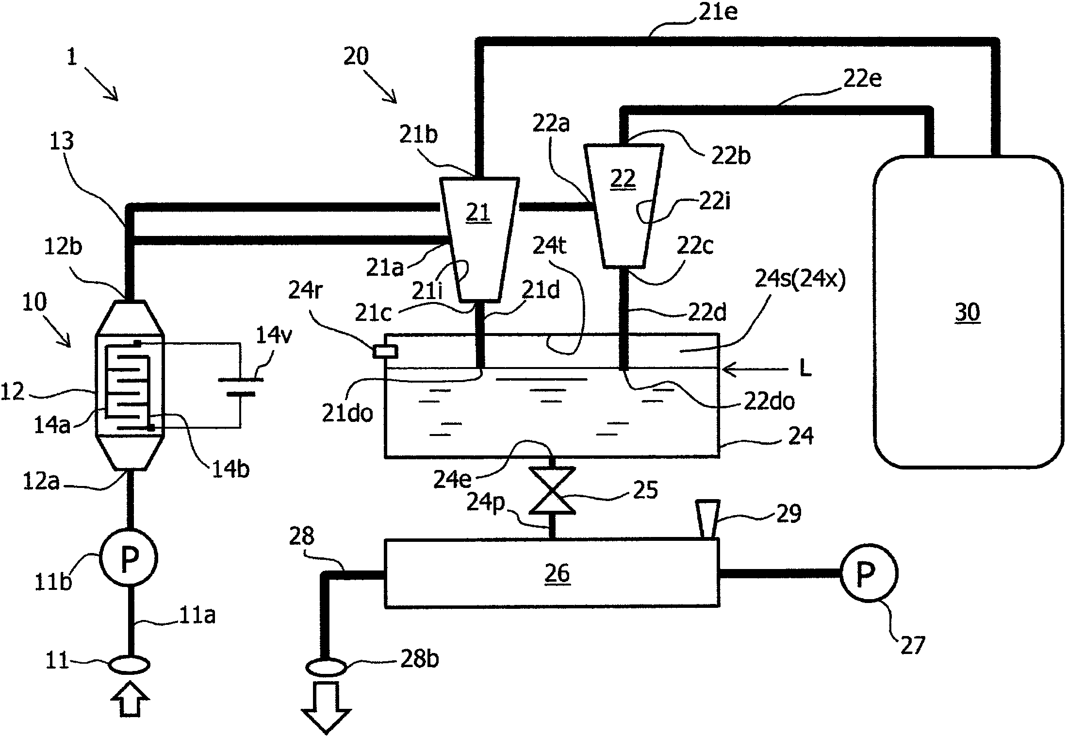 另外,尽管针对多个旋液分离器设置有共同的下液容器,在各旋液分离器中分离水也不会逆流。