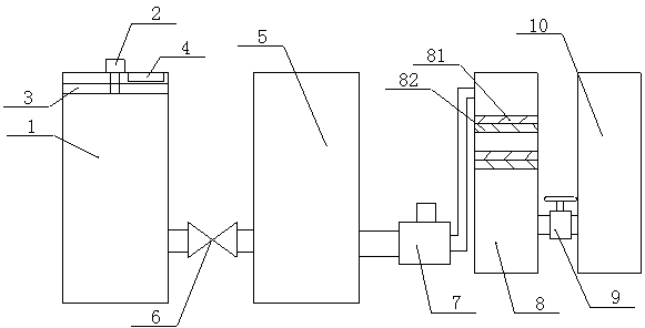 1.一种高效率废水处理机构,其特征在于:它包含过滤池(1)、驱动电机(2)、滤网机构(3)、消磁清理器(4)、反应池(5)、输送泵(6)、臭氧泵(7)、电场水处理器(8)、阀门(9)、储水池(10),过滤池(1)的上端安装有盖板,盖板上设置有进水口(1-1),盖板的下侧设置有滤网机构(3),滤网机构(3)的中部与驱动电机(2)的转轴连接,消磁清理器(4)安装在盖板的底部,且设置在进水口(1-1)的一侧,过滤池(1)通过管道、输送泵(6)与反应池(5)连接,反应池(5)通过臭氧泵(7)与电场水处理器(8)连接,水处理器(8)内设置有数个活性炭层(81)与吸附层(82),水处理器(8)通过管道、阀门(9)与储水池(10)连接。
