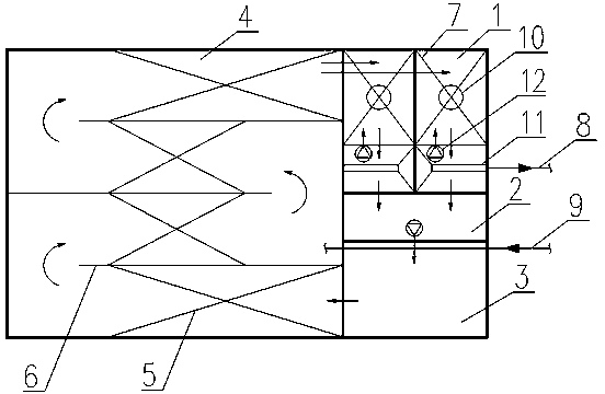 1.多点进水改良序批式活性污泥系统,其特征在于:所述系统由隔墙分割为副反应池(1)、回流污泥预缺氧池(2)、厌氧池(3)、主反应池(4)而成,其中,副反应池(1)通过隔墙的连通孔连接至回流污泥预缺氧池(2)的污泥进口,副反应池(1)通过净化水管道(8)连接至外部净化水收集处;回流污泥预缺氧池(2)中设置污泥泵,污泥泵的出口连接厌氧池(3)的污泥进口;厌氧池(3)通过隔墙的连通孔连接至主反应池(4)的混合液进口,主反应池(4)由隔板(6)分隔为多级S型廊道,S型廊道内间隔设置两处以上的主曝气装置(5);污水管道(9)经过厌氧池(3)的污泥进口延伸至主反应池(4)并盘置于其中,污水管道(9)的进口连接自外部待处理污水系统,污水管道(9)在厌氧池(3)的污泥进口处设置一个出水口,污水管道(9)在未设置主曝气装置(5)的廊道内设置两个以上的出水口;主反应池(4)的出口通过管道分别连接至副反应池(1)的进口。