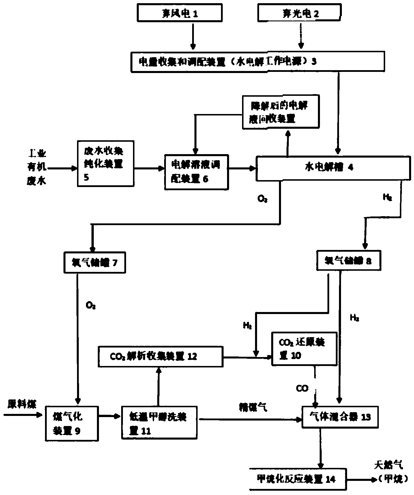 风、光弃电和工业有机废水用于煤制天然气的系统,包括收集弃风电1和 弃光电2的电量收集和调配装置3,和电量收集和调配装置3连接的水电解槽4, 废水收集纯化装置5通过电解溶液调配装置6连接水电解槽4,水电解槽4的阳 极连接氧气储罐7,阴极连接氢气储罐8,氧气储罐7的出口依次连接煤气化装 置9、低温甲醇洗装置11和气体混合器13,气体混合器13的入口和氢气储罐8 的出口连接,在低温甲醇洗装置11与气体混合器13间依次连接有二氧化碳解 析收集装置12和二氧化碳还原装置10,二氧化碳还原装置10的入口还与氢气 储罐8的出口连接,气体混合器13的出口连接甲烷化反应装置14。