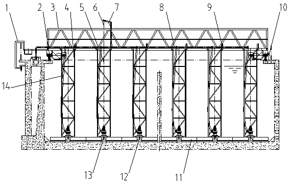 与现有技术相比,本实用新型在主梁上增设了一个用于起吊潜水泵的起吊装置,通过该起吊装置从而调整潜水泵距离池底的距离,从而避免吸泥机的阻塞。