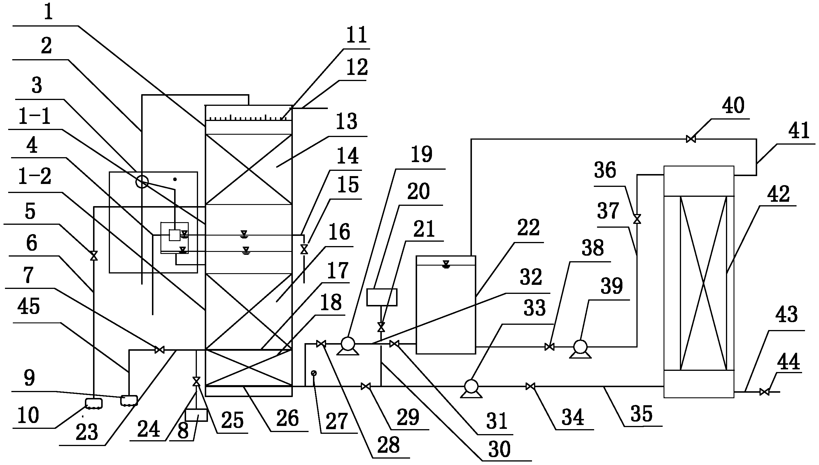 进水管(2)的一端与罐体(1)的顶端相连通,进水管(2)上设有水力控制蝶阀(3), 曝气机(10)通过通风曝气管(6)与机械通风曝气塔(1-1)的上端连通,通风曝气管(6) 上设有通风进气阀(5),反洗空压机(9)通过反洗配气管(45)与反洗大阻力配气系统(17) 相连通,反洗配气管(45)上设置有滤罐反洗曝气阀(7);