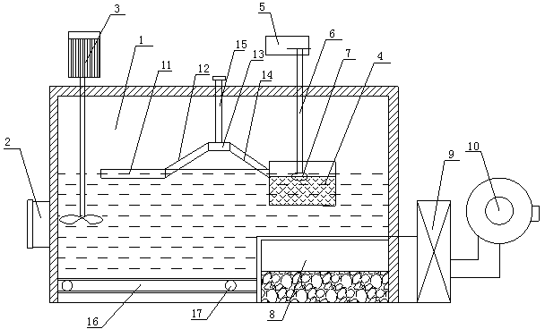 1.一种改进的高效污水处理箱,包括箱体,所述箱体一端开有污水进口,其特征在于:所述箱体的污水进口设有曝气机,所述箱体内上部设有浮料收集装置和杂质分离框,所述箱体顶部设有吸风机,所述吸风机通过管道插于箱体内,所述管道底部安装有吸嘴盘,所述吸嘴盘正对杂质分离框内侧,所述箱体底部设有输送装置,所述输送装置与污泥收集箱连接,所述污泥收集箱与烘干箱连接,所述烘干箱出风口与旋风分离器连接。