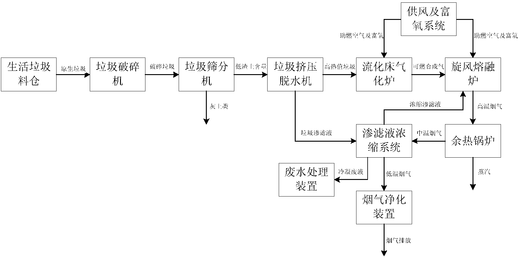 本发明进一步的改进在于:生活垃圾料仓中的原生垃圾通过垃圾破碎机破碎 后,进入垃圾筛分机,通过筛分去除粒径小于2mm的灰土类废物之后,进入垃 圾挤压脱水机,通过挤压脱水降低垃圾含水率;经垃圾挤压脱水机处理后的垃圾 进入流化床气化炉内与空气及富氧发生气化反应,产生可燃气体进入旋风熔融炉 进行高温燃烧,使其中的飞灰熔融为液态熔渣,而燃烧产生的高温烟气进入余热 锅炉进行余热回收;经过余热锅炉换热之后的中温烟气进入渗滤液浓缩系统,为 渗滤液浓缩提供热源;而从渗滤液浓缩系统排出的浓缩渗滤液喷入旋风炉进行高 温焚烧,从渗滤液浓缩系统排出的冷凝废液进入废水处理系装置进行处理,经过 渗滤液浓缩系统换热后的低温烟气经过烟气净化装置后排入大气。