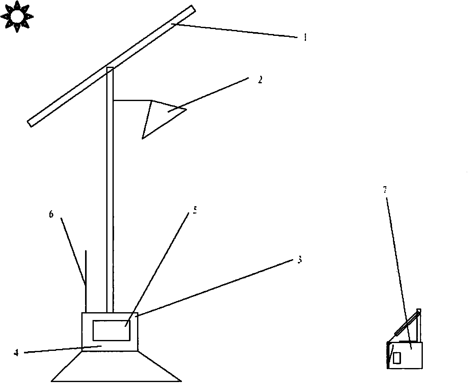 该杀菌装置由支架、太阳能光伏电池板、LED紫外灯、蓄电池、控制单元、紫外线辐射传 感器及防护罩组成,其中支架的顶端安装有太阳能光伏电池板,下端安装有控制单元及蓄电 池,其中控制单元包括遥控接收模块及数字显示器,支架的上端安装有与蓄电池连接的LED 紫外线灯,紫外线辐射传感器安装于地面附近,其外侧罩有防护罩,防护罩的前侧设有防护 快门,防护快门通过连杆与直线电机相连,防护罩的顶面安装有雨滴检测传感器;