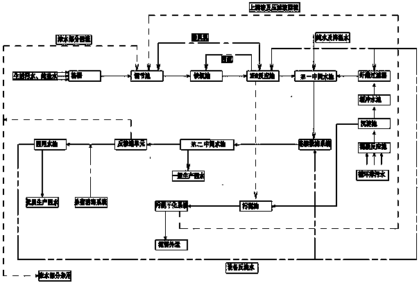 优选地,所述的连续微滤系统连接第二中间水池,经连续微滤系统过滤后的水导入第二中间水池中进行沉淀后能得到生产回用水。