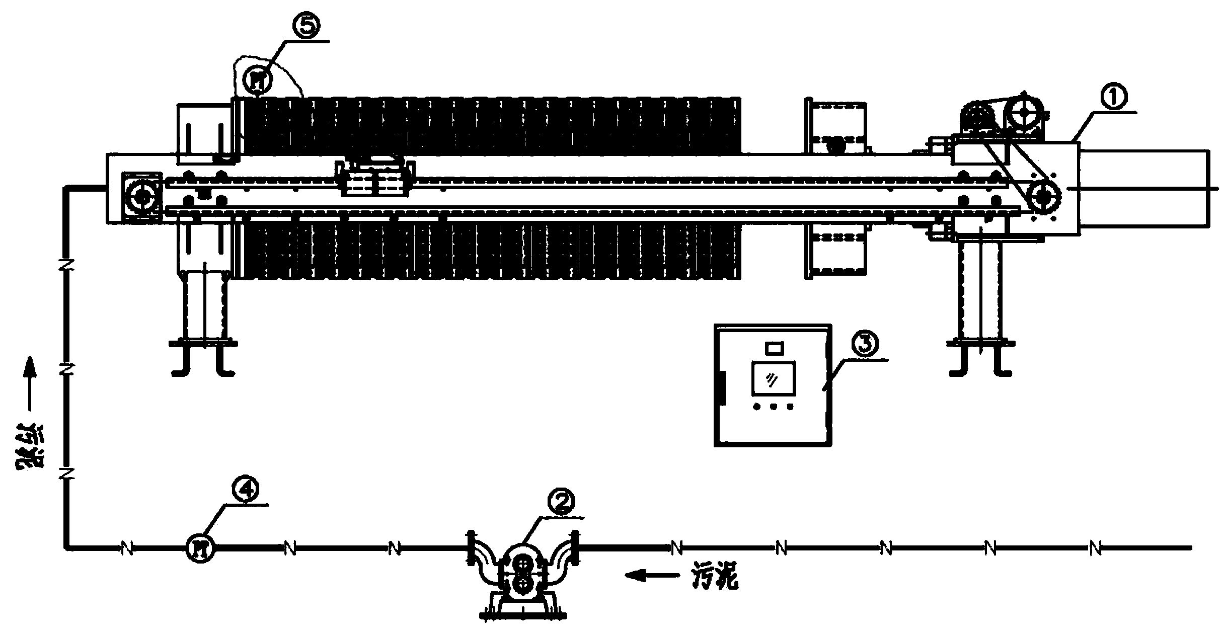 上述污泥压榨设备自动进泥控制系统的具体控制过程如下:污泥 压榨设备在启动PLC自动进泥控制系统时开启进泥泵,同时压力传感 器反馈压力数值,此时的压力会维持在0.1MPa以下,继续进泥,当 污泥压榨设备腔体充满污泥时,压力会迅速上升到设定压力0.6MPa~ 0.7MPa,此时停止进泥泵1~2分钟并检测污泥压榨设备腔体内的污 泥湿度值即进泥含水率;当腔体内的污泥湿度值大于设定数值70%~ 75%时,系统继续循环进泥;当湿度值达到设定数值70%~75%时,自 动进泥控制系统停止。
