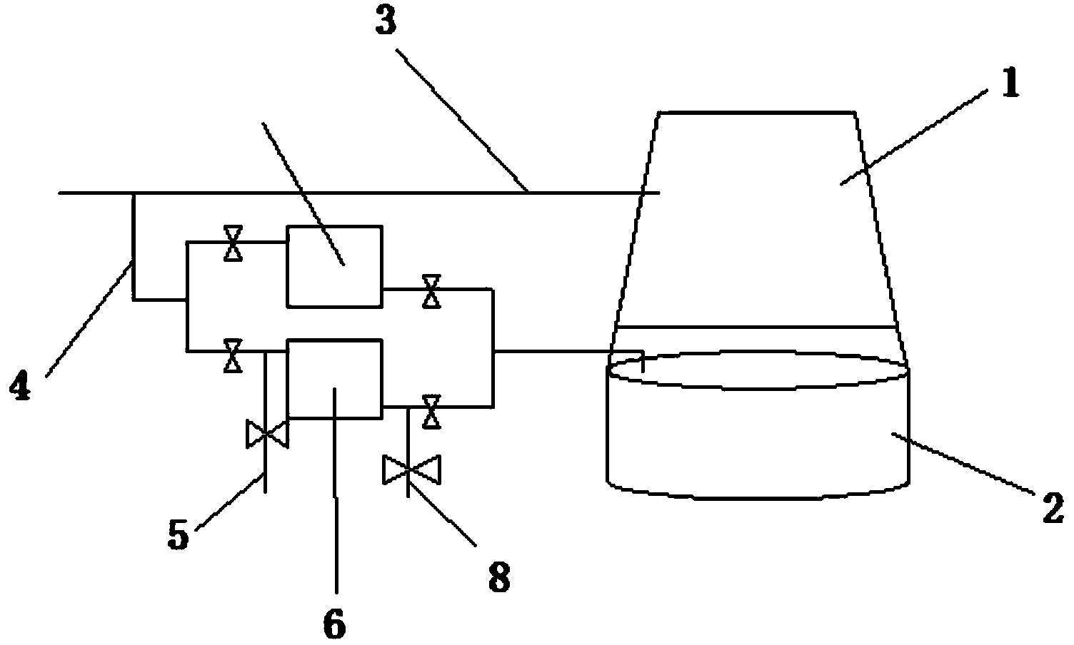 本实用新型的水处理系统,从循环水主管道将循环水引出一部分进入 到并联的多个过滤器或或沙滤罐中,对引出的循环水进行过滤,并根据压 力差合理选择过滤器进行过滤,例如,当其中以个过滤器的的滤芯被堵塞 时,过滤器两侧的压力不同,此时可以选择另外的过滤器进行过滤。