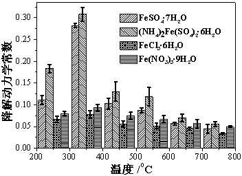 (1) 将污泥置于铁盐水溶液中室温搅拌3-10 h,将所得悬浊液离心,固体置于烘箱中105℃烘干,其中,铁盐和污泥的质量比为0.5-100 mg/g;