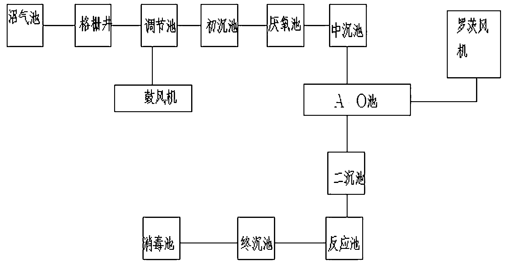1、养殖废水首先经过猪场外设置的沼气池进行初步的厌氧发酵,将大分子物质初步分解。出水进入格栅井,两道人工格栅分别对悬浮物质进行过滤,除去粗大漂浮物,保护后续工艺中设备的正常运行。然后进入调节池,在调节池中加入氢氧化钠碱液,同时通用鼓风机对水中的氨氮进行吹脱。在泵的作用下进入初沉池,利用重力的作用,进一步分离去除污水中颗粒较大的悬浮物质,出水自流进入厌氧池,在厌氧池中大分子有机物分解为小分子有机物,提高了废水的可生化性,去除了废水中一部分的CODcr及BOD5。厌氧池后设置中沉池,沉淀后的厌氧泥回流至厌氧池,以避免厌氧池的污泥流失。中沉池出水进入A/O池进行生化处理,生化池可去除大部分的SS、CODcr及BOD5,A/O池出水进入二沉池进行沉淀处理。A池中的水由三部分组成,一是中沉池出水,二是由调节池引进的污水,三是加入150吨清水。二沉池中污泥回流至A/O池,剩余污泥排至污泥池。二沉池出水进入反应池,进行絮凝沉淀处理,该化学絮凝法主要是作为污水处理达标排放的保障措施,尤其在冬季气温低,生化处理效果降低的情况下使用化学絮凝,能保障污水处理达标排放。絮凝沉淀池出水流入终沉池,沉淀去除由于絮凝反应产生的污泥,出水最后进入消毒池,经过次氯酸钠消毒杀菌后出水排放流入河流。本发明经A到K步骤处理后,出水水质CODCr≤100mg/L。完全达到国家《污水综合排放标准》(GB8978-1996)中的第二类污染物最高允许排放浓度中的Ⅰ级标准,而本发明的各个工艺步骤操作简单,易于控制,人工使用量小,污水经过A到K步骤处理时间大概为3-4天,用到的设备成本低,不用购买大型的国产农村野外A片性视频,使用寿命长。用于存储污水的各个池子,都是用混凝土制成,使用寿命长,占地面积小,处理方法对环境无污染,剩下的污泥还可以作为生物有机肥的原料,有利于环保。