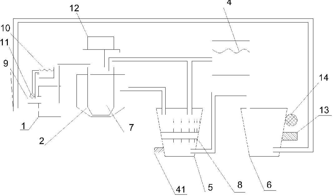 包括处理槽(1)、沉淀槽(2)、废气收集器(4)、净化器(5)和碳吸附塔(6),其特征在于,沉淀槽(2)内部设有过滤层(7),过滤层(7)覆盖在沉淀槽(2)内部表层,净化器(5)内设有多层过滤大分子物质的过滤分子膜(8),处理槽(1)、沉淀槽(2)、净化器(5)和碳吸附塔(6)通过水运输管道(9)依次连接,沉淀槽(2)、净化器(5)与废气收集器(4)由气体运输管道(9)连接。