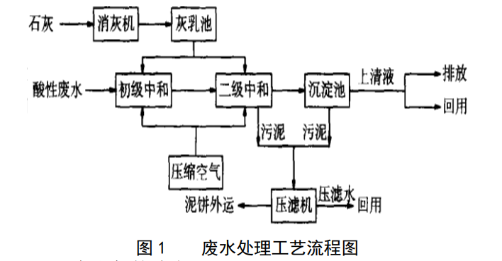 原工艺采用普通中和、沉淀法,该工艺对 pH 值控制较高,Fe2+不易沉淀,出水很难达标。改造后采用中和、曝气、沉淀法,工艺流程见图 1。